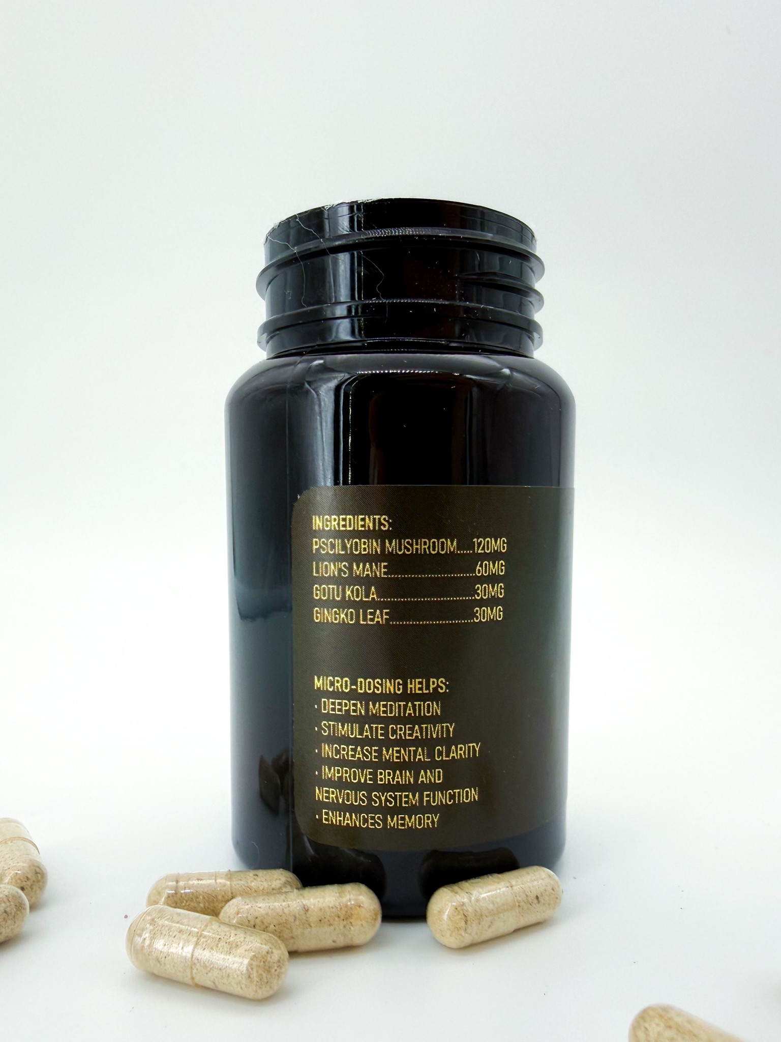 Psilocybin Mushroom (120 mg), Lion’s Mane (60 mg), Gotu Kola (30 mg), Ginkgo Leaf (30 mg)